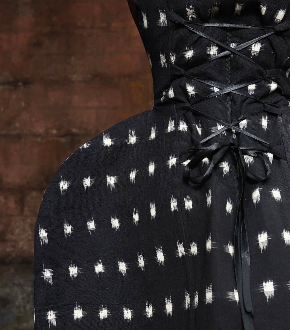 AMA dress by Hertunba: This stunning piece showcases aged linen Akwete fabric with a visually striking pattern rooted in cultural significance. The beaded neckline and exaggerated hip curves create a dramatic silhouette, while the small cleavage cutout adds a touch of sophistication. Perfect for making a statement at any event, the AMA dress effortlessly blends tradition and modern elegance.