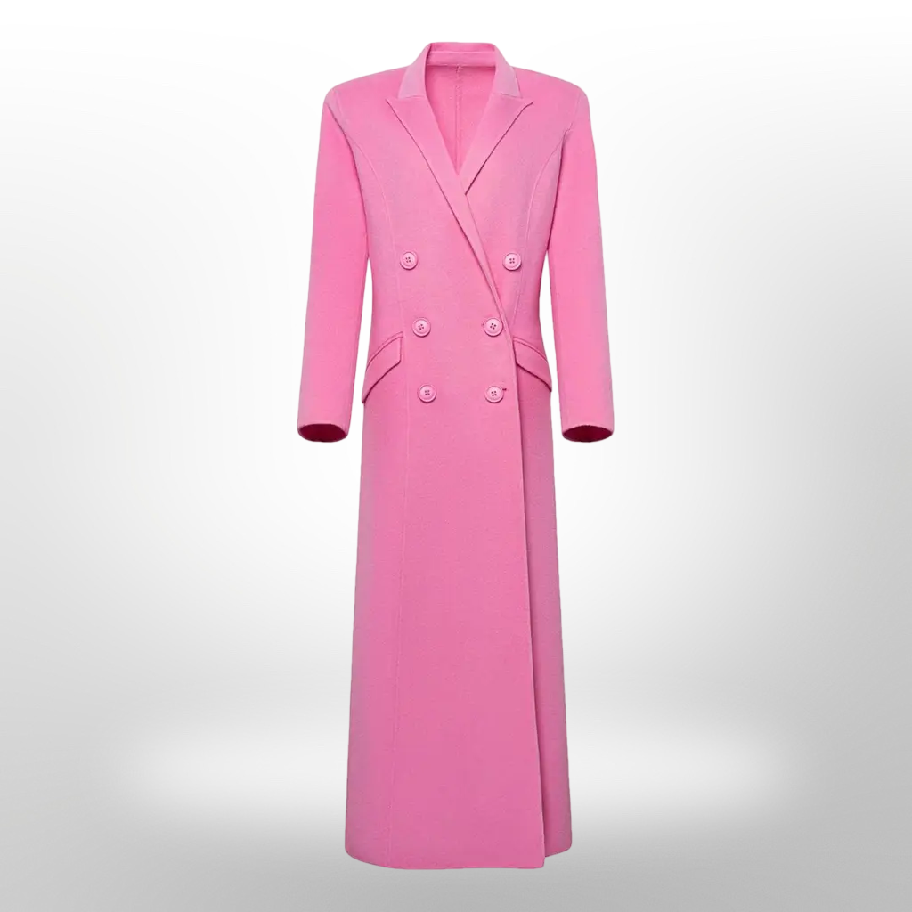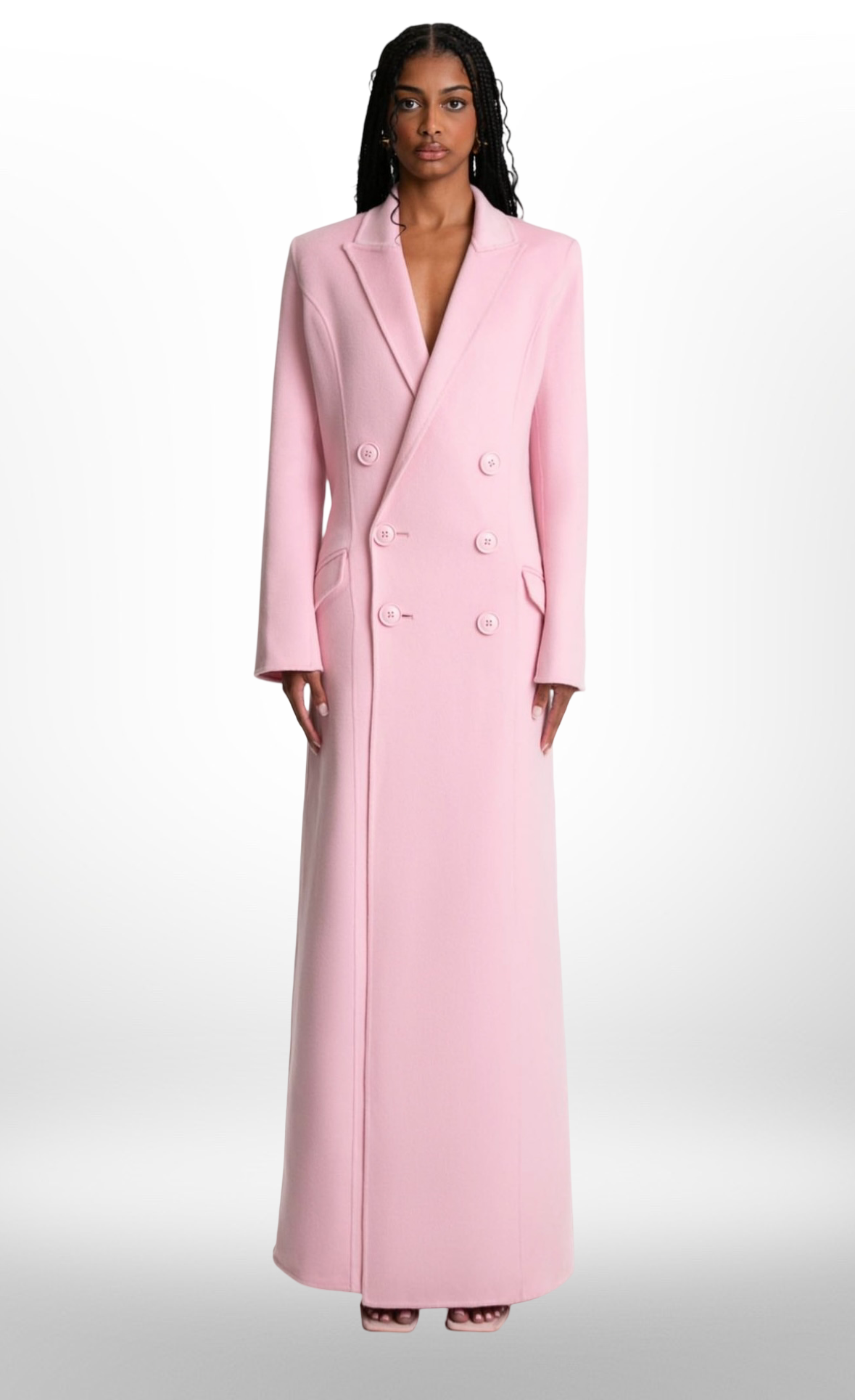 Fay Double Breasted Coat by Hanifa: The perfect city glamor - Fay reigns supreme. This stunning piece showcases structured tailoring with a modern twist. The double-breasted front and triplet buttons create a striking silhouette, while concealed details and functional pockets add a touch of sophistication. Perfect for making a statement, the Fay coat effortlessly blends tradition and innovation.